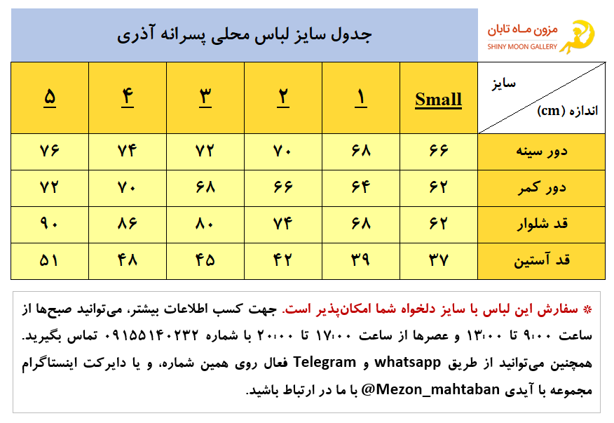 جدول سایزبندی لباس در تصویر آخر موجود است. چنانچه سایز سفارش شما با جدول سایز مغایرت دارد، در واتساپ به شماره 09155140232 پیام دهید. زمان آمادهسازی و ارسال سفارش شما متناسب با موجودی فروشگاه، بین 2 تا 10 روز خواهد بود. لطفاً در صورتی که محدودیت زمانی دارید، قبل از ثبت سفارش از طریق راه ارتباطی ذکر شده (واتساپ یا تماس تلفنی) استعلام زمانی بگیرید.