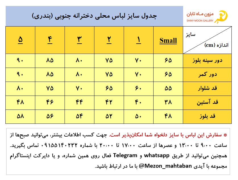 این لباس دخترانه برگرفته از لباس محلی جنوبی طراحی شده است و به همراه تاج و تور و یا کلاه تور دار ارائه میشود. جدول سایزبندی لباس در تصویر آخر موجود است.چنانچه سایز سفارش شما با جدول سایز مغایرت دارد، در واتساپ به شماره 09155140232 پیام دهید.زمان آمادهسازی و ارسال سفارش شما متناسب با موجودی فروشگاه، بین 2 تا 10 روز خواهد بود. لطفاً در صورتی که محدودیت زمانی دارید، قبل از ثبت سفارش از طریق راه ارتباطی ذکر شده (واتساپ یا تماس تلفنی) استعلام زمانی بگیرید.